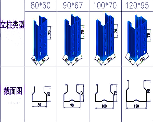 重型貨架又稱為托盤貨架和橫梁貨架,可以說是最為廣泛使用的貨架類型之一。其特點顯著:造價低,拆裝方便簡單、穩定可靠。那么其組成部件的型材規格是怎么樣的呢?下面就由小編帶大家認識一下立柱型材的規格。