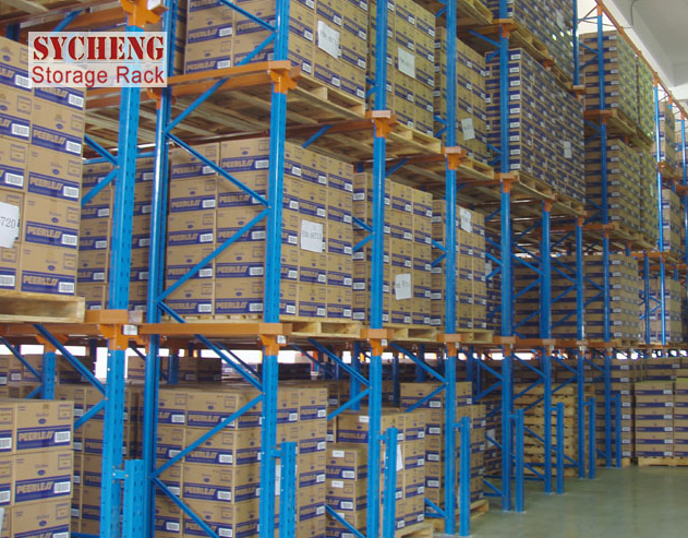 又稱通廊式貨架、駛?cè)胧截浖堋4讼到y(tǒng)貨架排布密集,空間利用率極高,幾乎是托盤式貨架的兩倍,但貨物必須是少品種大批量型,貨物先進(jìn)后出。首先須進(jìn)行集裝單元化工作,確定托盤的規(guī)格、載重量及堆高。由此確定單元貨架的跨度、深度、層間距,根據(jù)倉(cāng)庫(kù)屋架下沿的有效高度確定貨架的高度。靠墻區(qū)域的貨架總深度最好控制在6個(gè)托盤深度以內(nèi),中間區(qū)域可兩邊進(jìn)出的貨架區(qū)域總深度最好控制在12個(gè)托盤深度以內(nèi),以提高叉車存取的效率和可靠性(此類貨架系統(tǒng)中,叉車為持續(xù)“高舉高打”作業(yè)方式,叉車易晃動(dòng)而撞到貨架)。